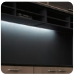The glass – door hanging cabinet on the upper part of the wall unit can be easily accessed (gas strut assisted). The open shelving below is practical with adjustable shelves.