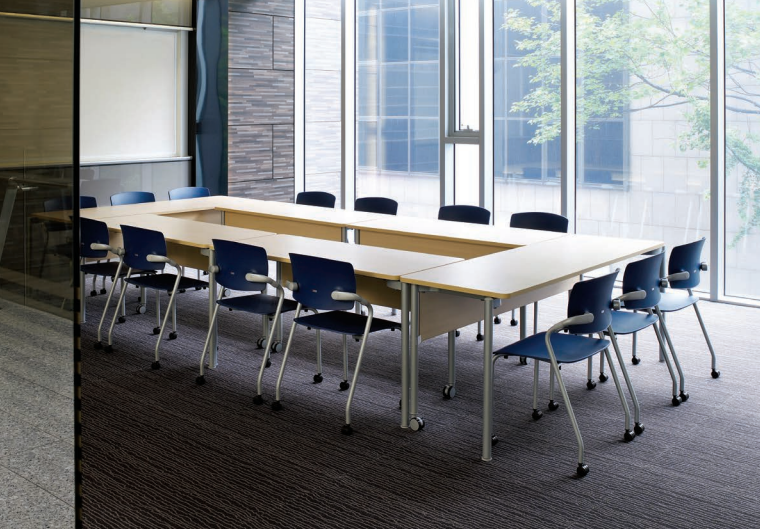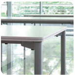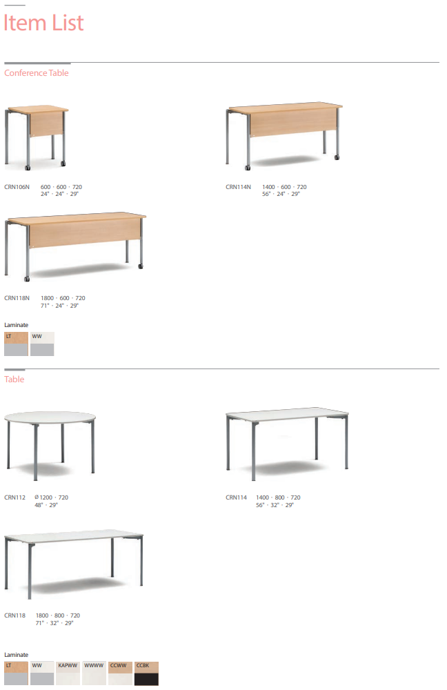 CRN1 Tables / TrainingCRN1Multi-purpose table CRN1,Select and combine to suit your space Simple frame design and systematic structure ensures tables can be neatly combined without protrusions. Turn gliders on bottom of legs to adjust height. Ensures that table can be installed horizontally on uneven surfaces. Table corners come with rounded edges for safety. White colored surface comes with silver line edge for a unique look.