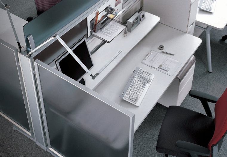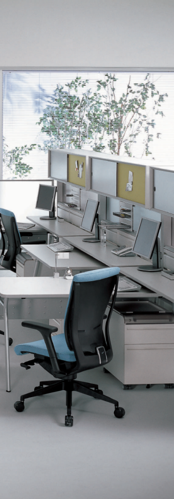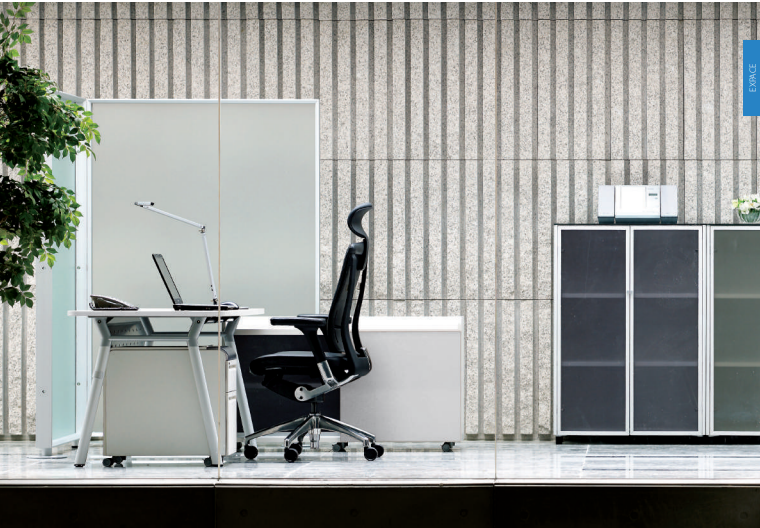The spine constitutes the basic spatial boundaries, and side panels can be attached to the spine to subdivide the space. Screens are also available for both the spine and desks to increase the degree of privacy for individual users. The EXPACE work tool boasts a sophisticated design and handy functions to enhance office work convenience.