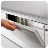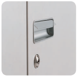The lower drawers of the combination unit can be locked safely and neatly from the shelf compartment above. Operation is neat and safe.