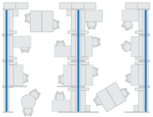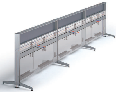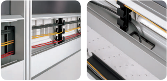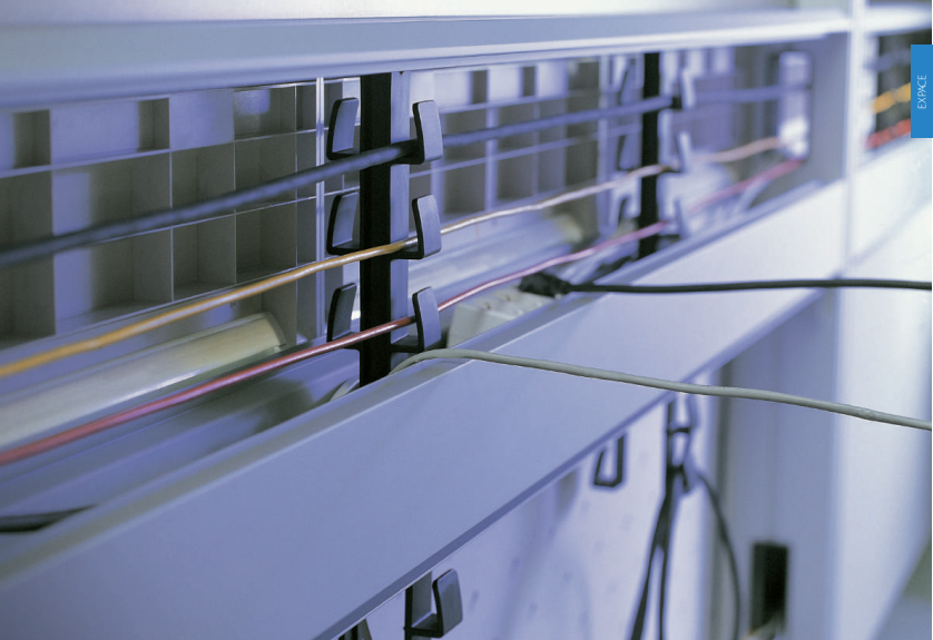The spine panels house numerous cables and provide secure access to electrical power and the computer network, serving as the backbone of the office wiring system. The desks as well as other office furniture can be positioned as desired, allowing for maximum IT utilization.