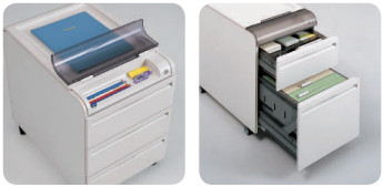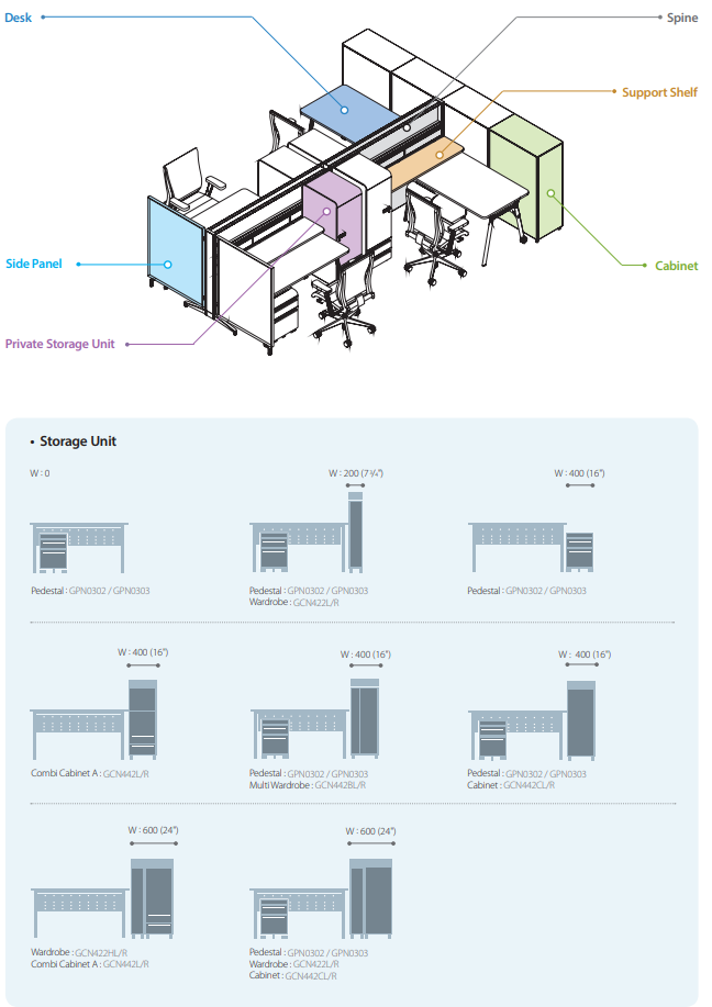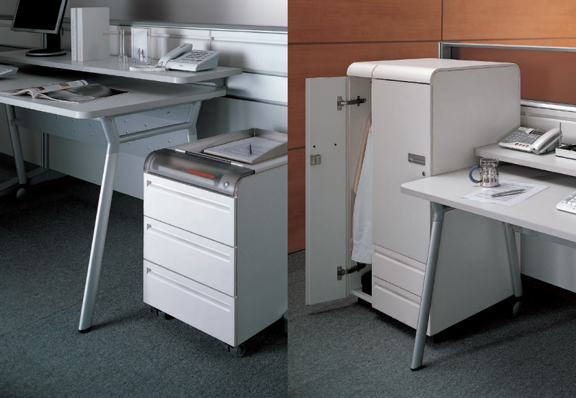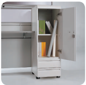 The combination unit consists of drawers and shelves, and the storage area is extended vertically to maximize office space utilization.
