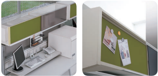One overhead cabinet offers storage space as well as a magnetic board for users on both sides. The cover material is available in various colors, providing a selection of accent colors to enhance the office decor