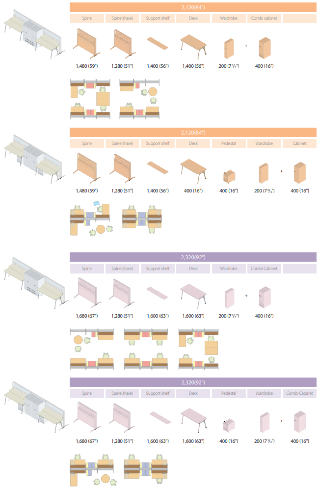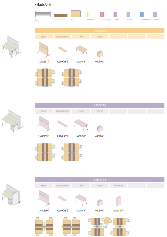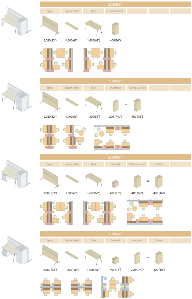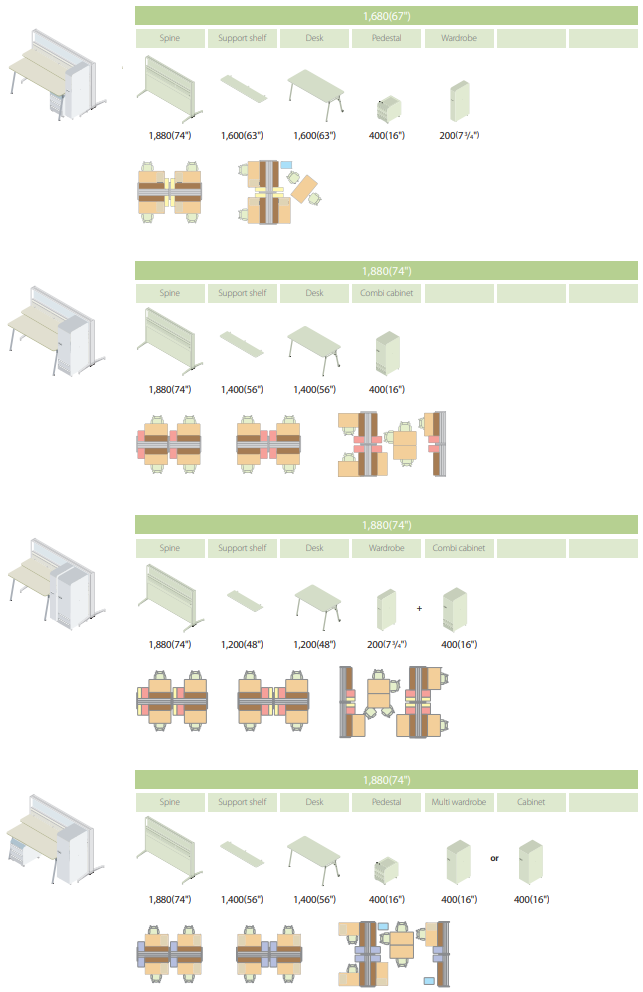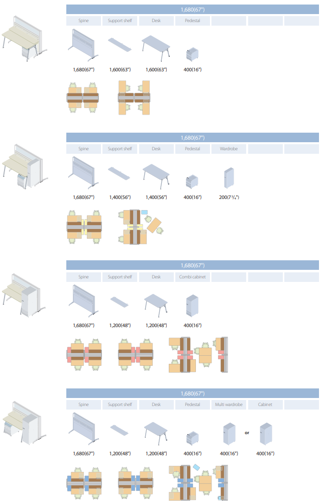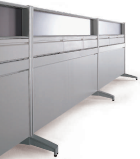 In addition to the spine, partition panels, side cabinets and conference tables are available to provide extra elegance to special office spaces such as senior executive offices, conference rooms and customer reception rooms.