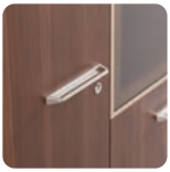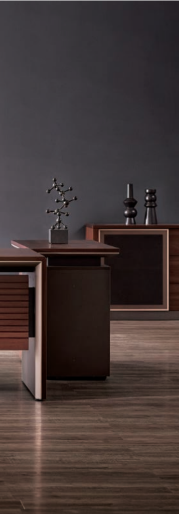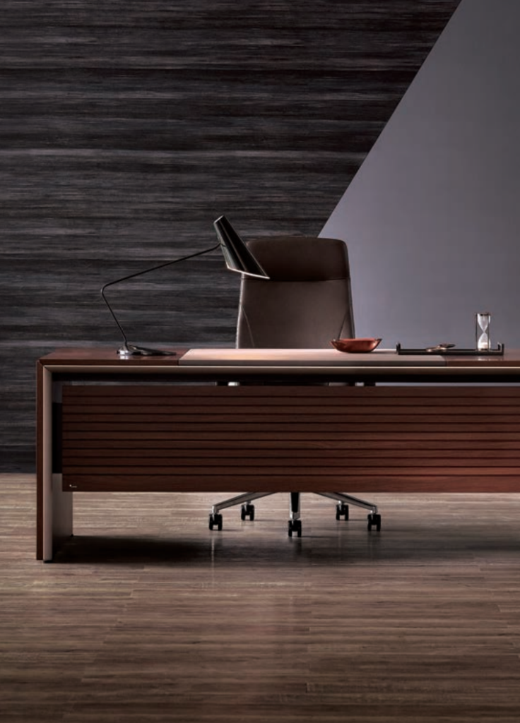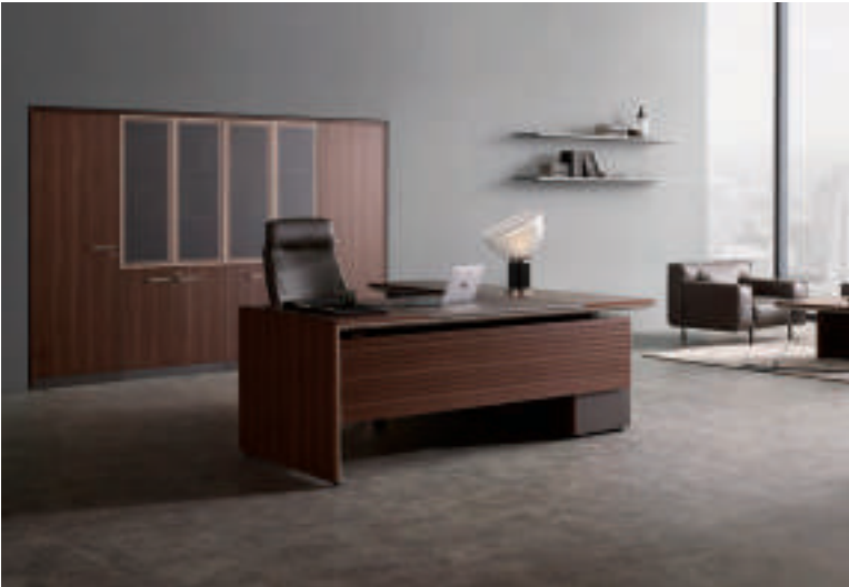 Front of desk comes attached with a fine wood front panel that has horizontal lines on it. It creates a distinguished, elegant business space.